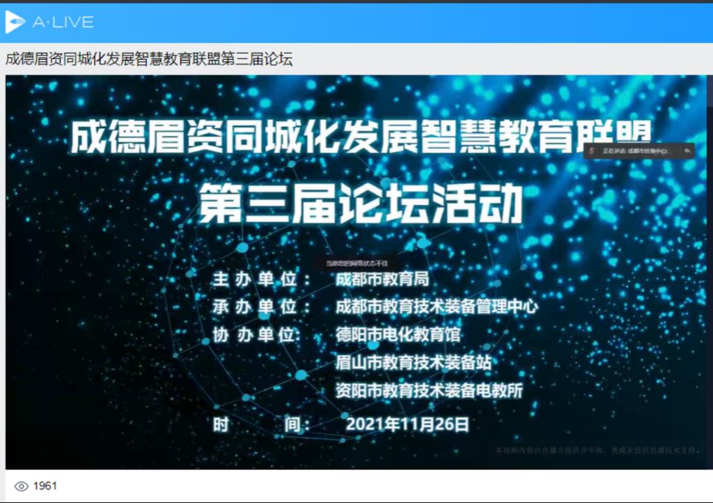 11月26日,“成德眉资同城化发展智慧教育联盟”第三届论坛活动在线上举行,此次活动由成都市教育局主办,成都市教育技术装备管理中心承办,采用“腾讯会议+在线直播”形式。