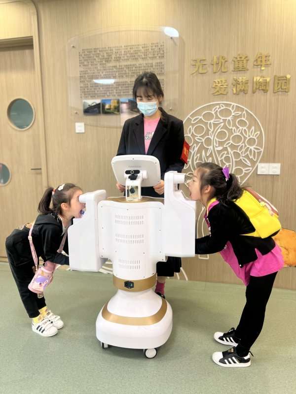 温州市第五幼儿园的孩子通过晨检机器人检查身体