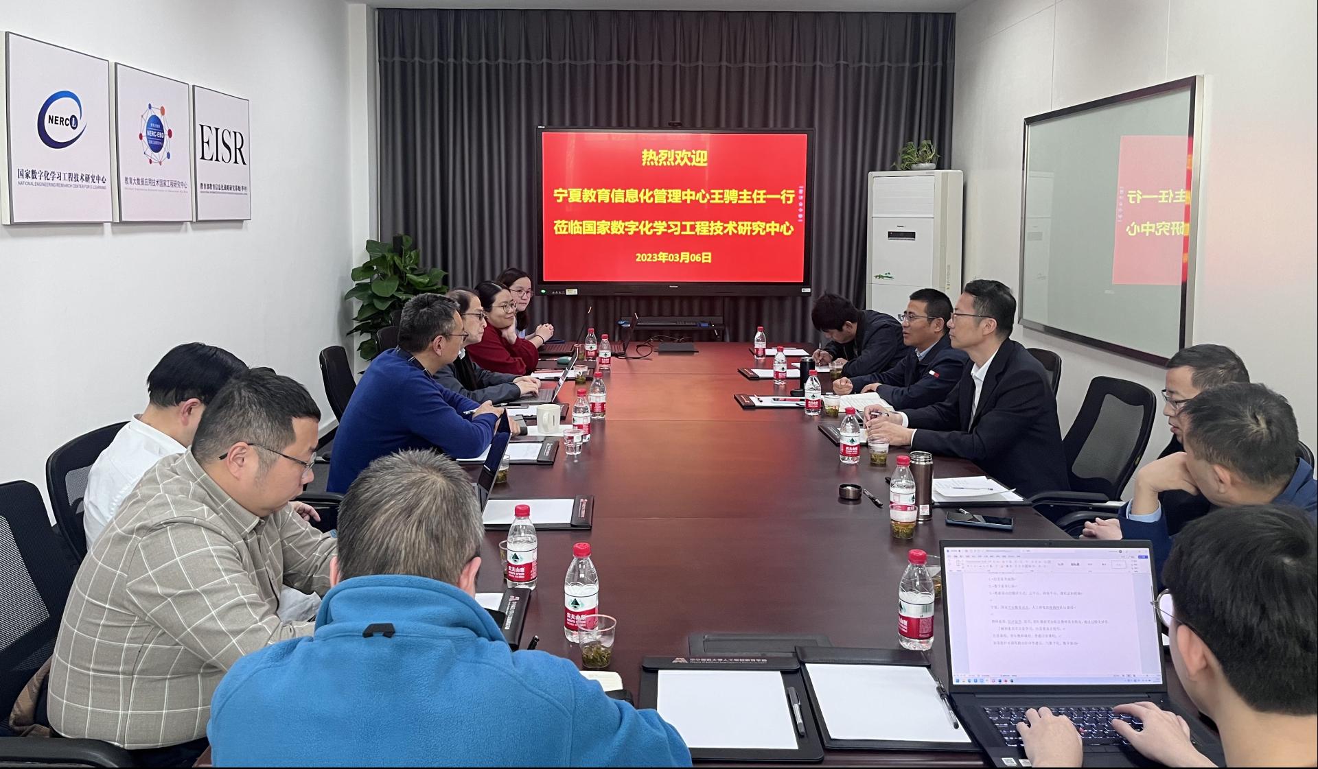 2023年3月6日,宁夏回族自治区教育信息化管理中心王聘主任、李永涛副主任、张建勇科长、杨俊灵老师、李云老师莅临国家数字化学习工程技术研究中心,基地常务副主任吴砥教授、副主任徐建老师、钟正副教授、陈敏副教授、李亚婷老师、周驰老师等出席了会议。