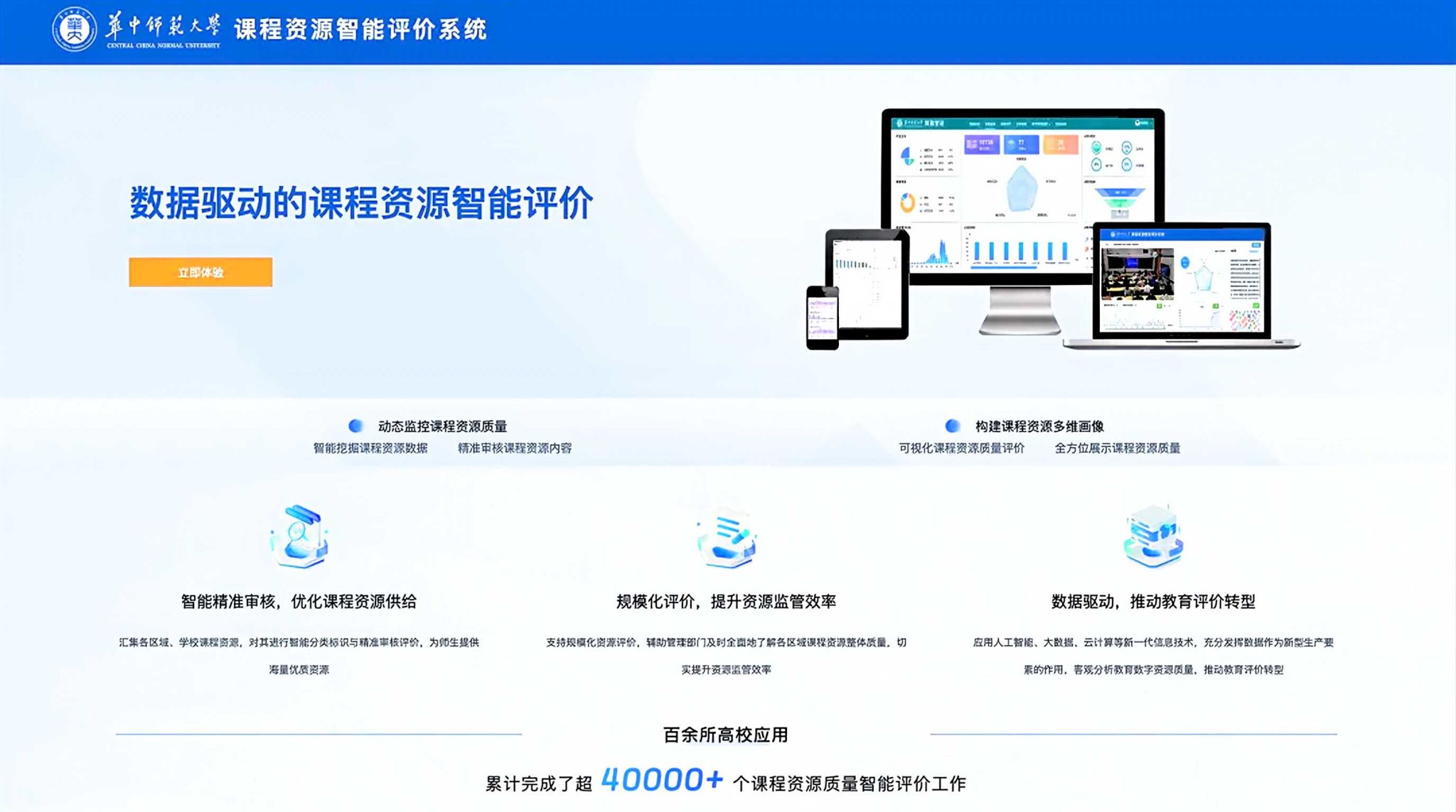 目前,该系统已在全国百余所大中小学校落地应用,累计完成课程资源智能评价4万余次,在湖北、宁夏等地的教育数字化改革实践中发挥了显著作用。通过智能系统的实时监测和精准分析,教育管理者能够动态掌握课程资源现状,快速识别优质课程与潜在风险资源,并据此推动精准教学研讨、教师能力提升和资源持续优化,构建起“实时监测—精准诊断—动态提升”的资源治理新模式,助力高校构建高质量教育生态。