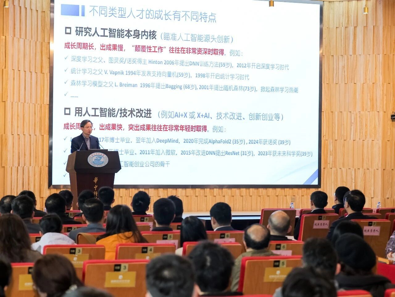 在专家主题报告环节,周志华作题为“人工智能发展及人才培养”的报告。他从人工智能的发展脉络切入,系统梳理了人工智能学科的发展历程,深入剖析了技术演进脉络与前沿趋势;围绕人工智能时代的人才需求,阐释了不同类型人工智能人才的培养定位与核心素养。他以南京大学的实践为例,结合自身深耕教学一线的实践,详细介绍了在人工智能人才培养体系建设方面的探索与经验,阐述了人工智能人才培养的体系构建与创新路径,为高校构建适应时代需求的人工智能专业教育提供了重要参考。
