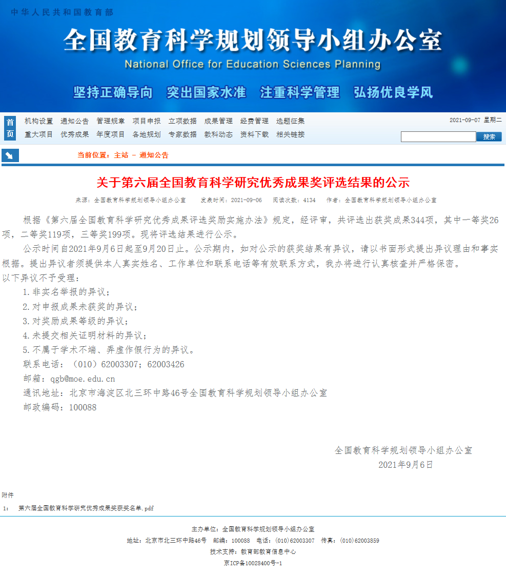 2021年9月6日,全国教育科学规划领导小组办公室公布了《关于第六届全国教育科学研究优秀成果奖评选结果的公示》,公示期已于2021年9月20日截止。