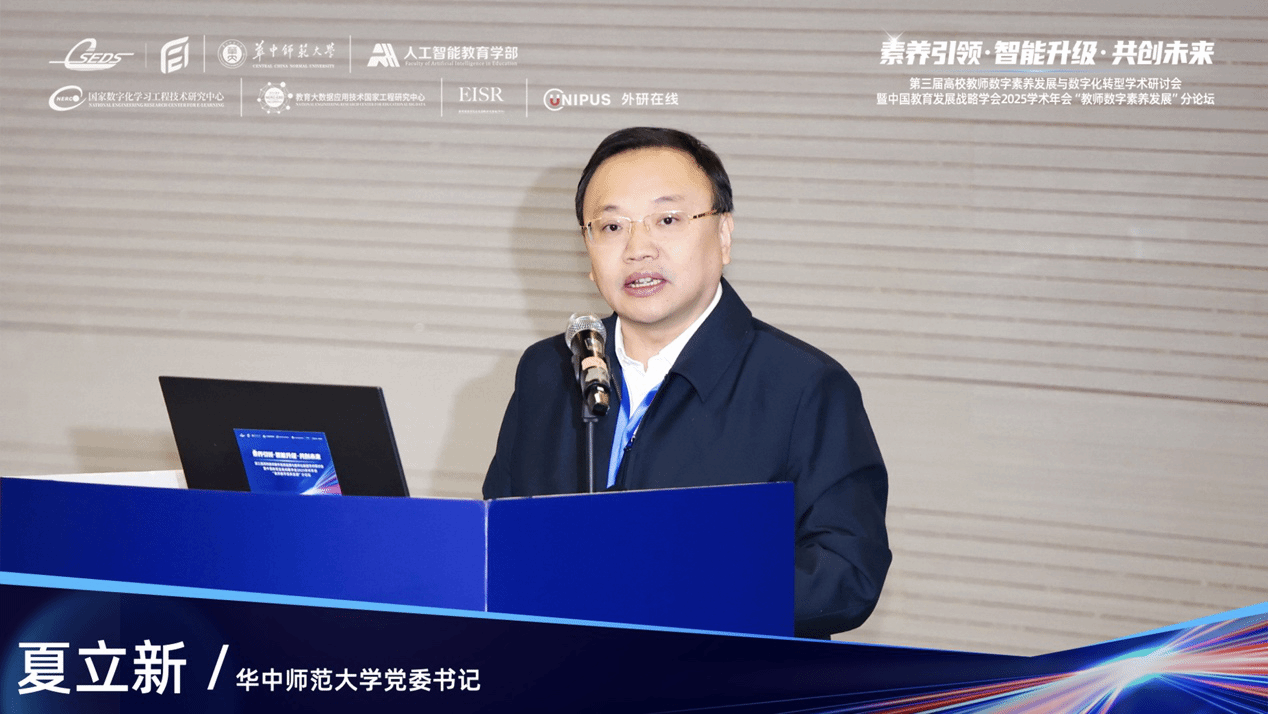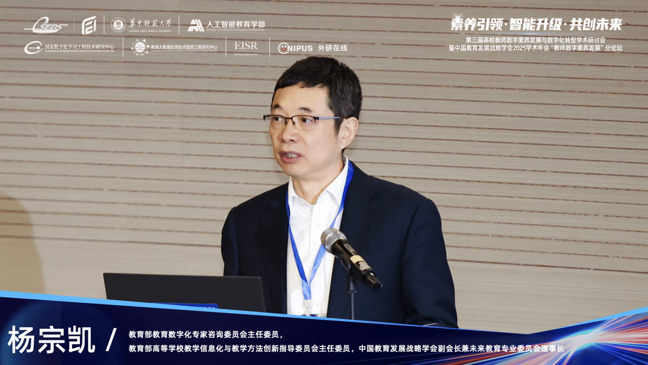 教育部教育数字化专家咨询委员会主任委员教育部高等学校教学信息化与教学方法创新指导委员会主任委员,中国教育发展战略学会副会长兼未来教育专业委员会理事长杨宗凯致开幕辞,强调教师角色转型与能力提升的重要性;华中师范大学党委书记夏立新分享学校在教师数字素养建设方面的三大实践路径;外语教学与研究出版社常小玲指出提升数字素养对支撑国家战略的关键作用。开幕式由华中师范大学人工智能教育学部副部长吴砥主持。