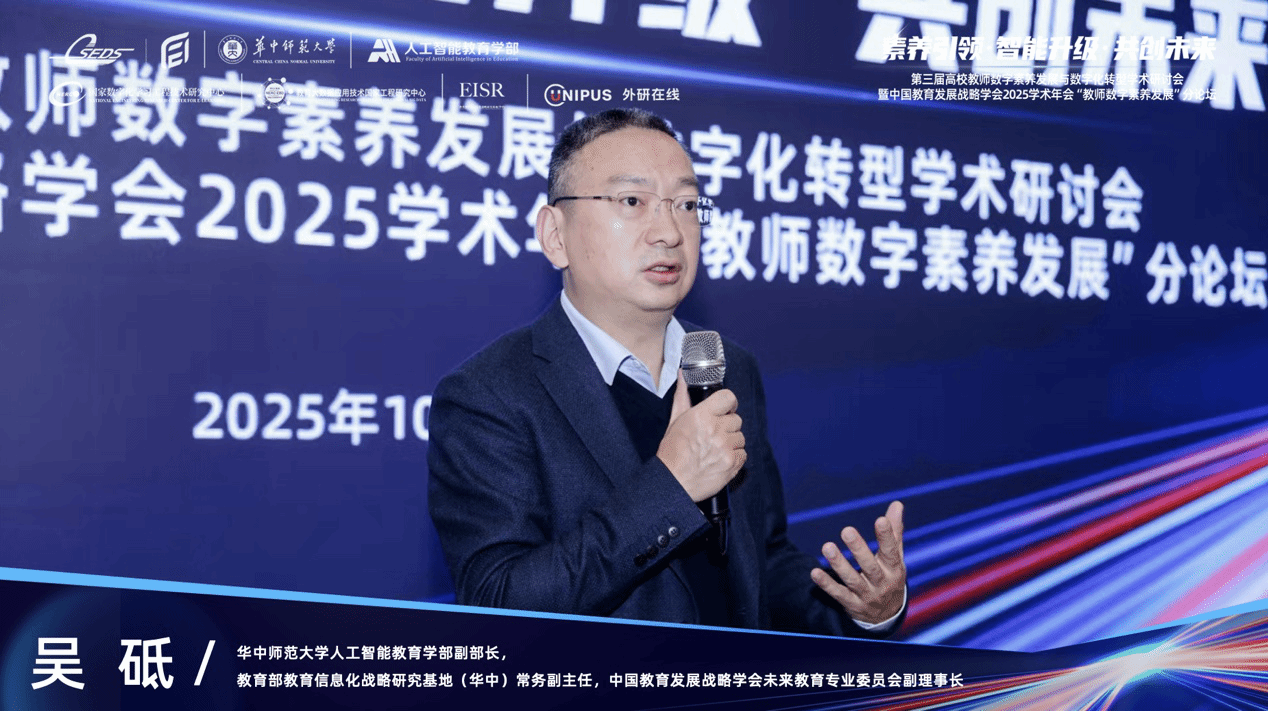 为深入实施国家教育数字化战略,2025年10月19日,"第三届高校教师数字素养发展与数字化转型学术研讨会暨中国教育发展战略学会2025学术年会教师数字素养发展分论坛"在我校召开。会议由中国教育发展战略学会未来教育专业委员会与华中师范大学联合主办,华中师范大学人工智能教育学部、国家数字化学习工程技术研究中心、教育大数据应用技术国家工程研究中心、教育部教育信息化战略研究基地(华中)、中国教育技术协会教师数字素养发展专业委员会(筹)承办,北京外研在线数字科技有限公司协办。