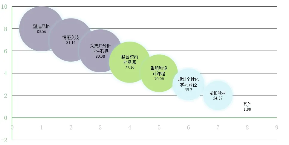 进一步分析未来教师角色变化,八成以上教师认为教师最重要的任务是塑造学生品格(83.56%)、加强情感交流(81.14)和采集(80.38%)。其次是整合校内外资源(77.16%)和课程开发(70.06%)。