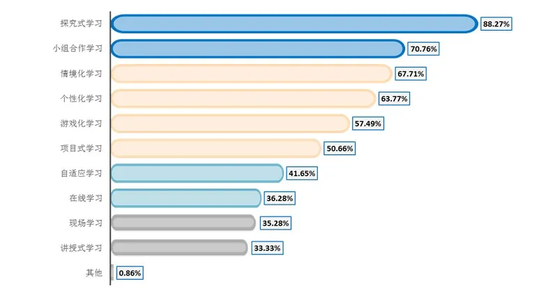 随着新课程改革、课堂革命的深入推进,在教育改革政策的落地过程中,教师对未来学习方式更加熟识和认可。调查显示,近九成教师认为未来教育最倡导的学习方式是探究式学习。在各项学习方式中,受访教师认为在未来教育中,最倡导的学习方式为探究式学习,88.27%的教师选择;其次是小组合作学习(70.76%)、情境化学习(67.71%)和个性化学习(63.77%),比例超过60%。